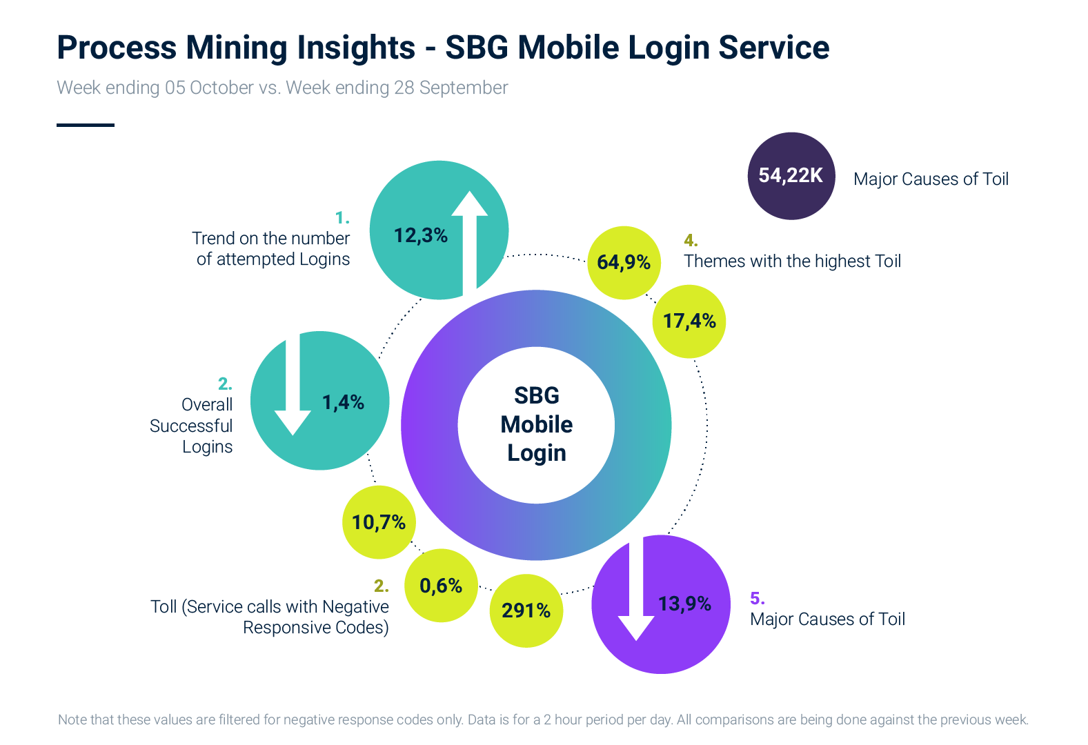 Below is a snapshot of a portion of Standard Bank’s weekly dashboard used by process managers to track the impact of online journey improvements. In this particular week, the percentage of successful logins dropped slightly while overall attempts were up significantly compared to the prior week. The dashboard indicates the trends for several root causes for rework.