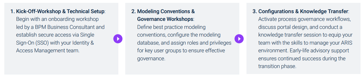 Begin your BPM journey with ARIS and achieve rapid results. Our Fast Track Service ensures you have the right tools, expertise, and support from day one, allowing your organization to focus on what matters most: driving business success.
