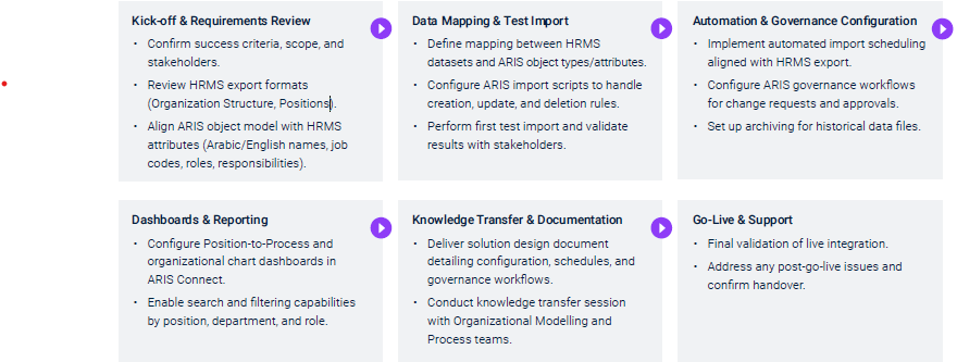 The engagement encompasses the configuration, implementation, and automation of HRMS data imports into ARIS, along with dashboards, governance, and knowledge transfer.